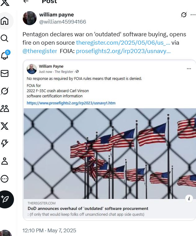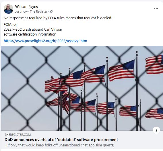 12/21/22. The statute of limitations for a FOIA claim is six years. However, a requester may refile their FOIA request to restart the statute of limitations.Feb 21, 201711/24/22. Airbus A220 autopilot warning. Full coverage.9/18/22 4/3/22 prosefights hacked. Again. :( Hacking attempted recovery 4.6.22. 2/5/22. __________________ 5/01/22. Linus Torvalds reveals the 'true' anniversary of Linux code.9/21/21. US Navy software FOIA request.9/3/21. Christopher Julka (703)-697-0031 DONFOIAPublicLiaison@navy.mil.8/24/21. c/c++ wind turbine software use too? NTSB 8/20/21 phone message.