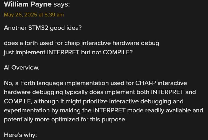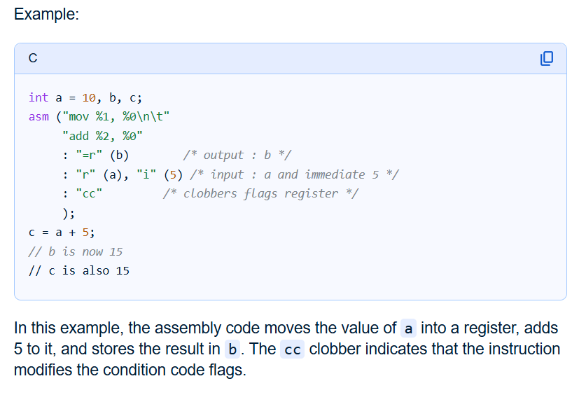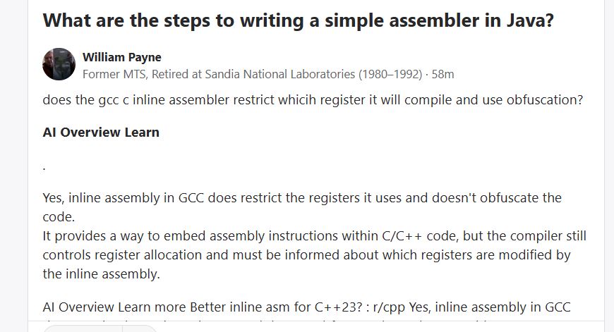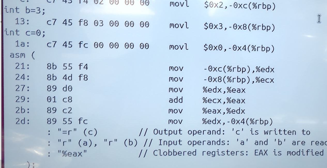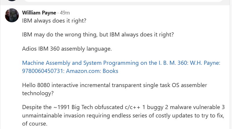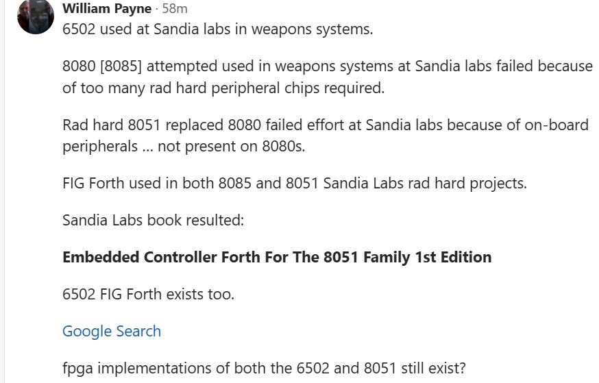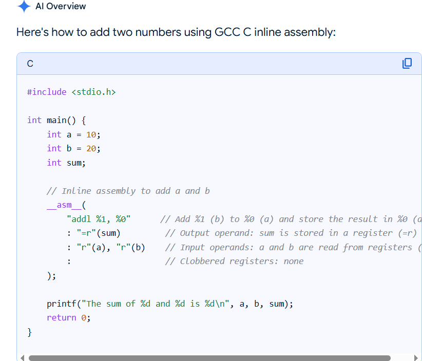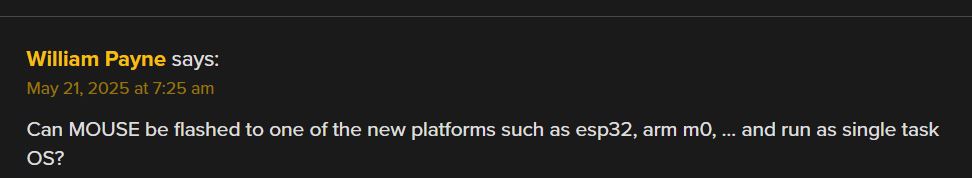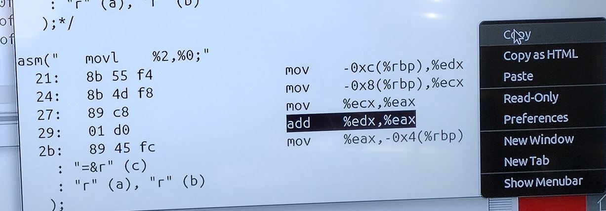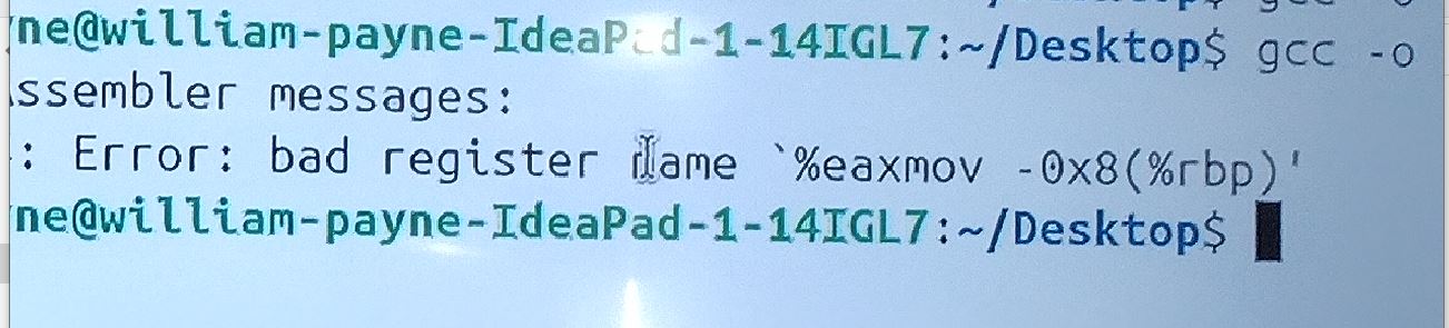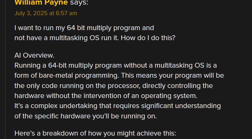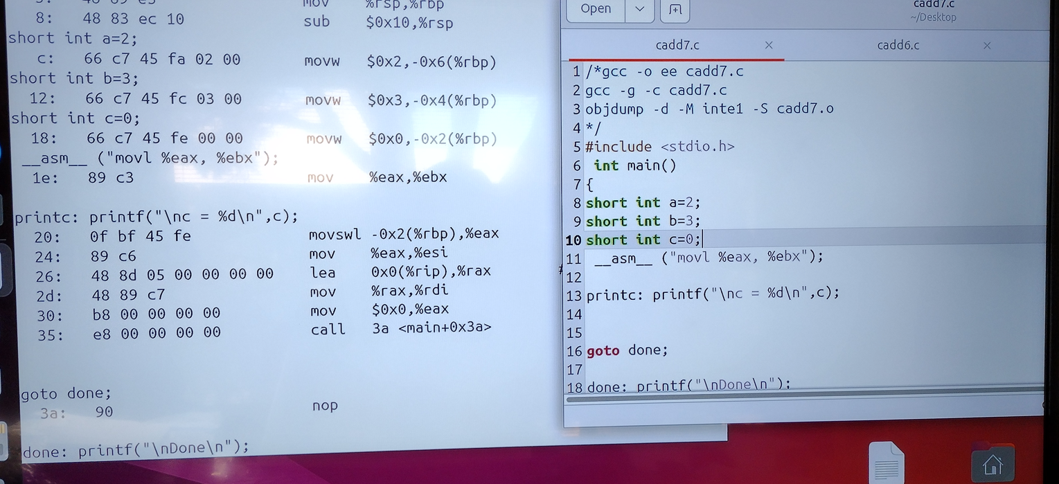 (264-1)(264-1) run on X86 platform p starting and endomg debug print. william-payne@william-payne-IdeaPad-1-14IGL7:~/Desktop$ gcc -o ee mul53.c william-payne@william-payne-IdeaPad-1-14IGL7:~/Desktop$ ./ee a[] = ffffffff:ffffffff exponentof(a) = 0 b[] = ffffffff:ffffffff exponentof(b) = 0 kk= 08 aa= ff bl=8 al=8 abl=16 add c[] = 00000000:00000000:00000000:00000000 c[0]= ff b[0]= ff aaaa=255 carry= 00 c[1]= ff b[1]= ff aaaa=255 carry= 00 c[2]= ff b[2]= ff aaaa=255 carry= 00 c[3]= ff b[3]= ff aaaa=255 carry= 00 c[4]= ff b[4]= ff aaaa=255 carry= 00 c[5]= ff b[5]= ff aaaa=255 carry= 00 c[6]= ff b[6]= ff aaaa=255 carry= 00 c[7]= ff b[7]= ff aaaa=255 carry= 00 c[8]= 00 aaaa=0 carry= 00 _____ middle of debug print omitted. c[0]= 01 b[0]= ff aaaa=257 carry= 01 c[1]= 00 b[1]= ff aaaa=256 carry= 01 c[2]= 00 b[2]= ff aaaa=256 carry= 01 c[3]= 00 b[3]= ff aaaa=256 carry= 01 c[4]= 00 b[4]= ff aaaa=256 carry= 01 c[5]= 00 b[5]= ff aaaa=256 carry= 01 c[6]= 00 b[6]= ff aaaa=256 carry= 01 c[7]= 00 b[7]= ff aaaa=256 carry= 01 c[8]= fe aaaa=254 carry= 00 c[9]= ff aaaa=255 carry= 00 c[10]= ff aaaa=255 carry= 00 c[11]= ff aaaa=255 carry= 00 c[12]= ff aaaa=255 carry= 00 c[13]= ff aaaa=255 carry= 00 c[14]= ff aaaa=255 carry= 00 c[15]= ff aaaa=255 carry= 00 add e c[] = 01000000:00000000:feffffff:ffffffffCode compiled with gcc c compilere on X86 platforem running Ubuntu. /*gcc -o ee mul53.c gcc -g -c mul53.c objdump -d -M inte1 -S mul53.o */ #include <stdio.h> int main() { static void *array[]={ &&byte7, &&byte6, &&byte5, &&byte4, /*0*/ &&byte3, &&byte2, &&byte1, &&byte0, /*4*/ &&bit80, &&bit40, &&bit20, &&bit10, /*8*/ &&bit80a, &&bit40a, &&bit20a, &&bit10a, /*12*/ &&bit08, &&bit04, &&bit02, &&bit01, /*16*/ &&bit08a, &&bit04a, &&bit02a, &&bit01a, /*20*/ &&init, &&add, &&printa, &&printc, /*24*/ &&shift, &&done, &&mul, &&byte9, /*28*/ &&bit01b, &&bit70}; &&alen, &&bit01c ; /*32*/ unsigned char a[8] ; // mltiplier unsigned char b[8] ; // mulplicand unsigned char c[16]; // product unsigned char aa,aaa,bb,bbb,bbbb,carry,carry0,carry1; int aaaa, al,bl,abl,kk,jj; short int exponentofa, exponentofb, exponentofc; init: a[0]=0xff; a[1]=0xff; a[2]=0xff; a[3]=0xff; a[4]=0xff; a[5]=0xff; a[6]=0xff; a[7]=0xff; exponentofa = 0; b[0]=0xff; b[1]=0xff; b[2]=0xff; b[3]=0xff; b[4]=0xff; b[5]=0xff; b[6]=0xff; b[7]=0xff; exponentofb = 0; c[0]=0x0; c[1]=0x0; c[2]=0x0; c[3]=0x0; c[4]=0x0; c[5]=0x0; c[6]=0x0; c[7]=0x0; c[8]=0x0; c[9]=0x0; c[10]=0x0; c[11]=0x0; c[12]=0x0; c[13]=0x0; c[14]=0x0; c[15]=0x0; exponentofc = 0; jj=100; goto printa; mul: if(b[7] != 0) {bl=8; goto alen;} // multiplicand if(b[6] != 0) {bl=7; goto alen;} if(b[5] != 0) {bl=6; goto alen;} if(b[4] != 0) {bl=5; goto alen;} if(b[3] != 0) {bl=4; goto alen;} if(b[2] != 0) {bl=3; goto alen;} if(b[1] != 0) {bl=2; goto alen;} if(b[0] != 0) {bl=1; goto alen;} printf("\n mul en\n"); alen: if(a[7] != 0) {al=8; abl=bl+al; goto byte7;} // multiplier if(a[6] != 0) {al=7; abl=bl+al; goto byte6;} if(a[5] != 0) {al=6; abl=bl+al; goto byte5;} if(a[4] != 0) {al=5; abl=bl+al; goto byte4;} if(a[3] != 0) {al=4; abl=bl+al; goto byte3;} if(a[2] != 0) {al=3; abl=bl+al; goto byte2;} if(a[1] != 0) {al=2; abl=bl+al; goto byte1;} if(a[0] != 0) {al=1; abl=bl+al; goto byte0;} printf("\n mul en\n"); goto printc; byte7: aaa=a[7]; kk=al; goto bit80; byte6: aaa=a[6]; kk=al; goto bit80; byte5: aaa=a[5]; kk=al; goto bit80; byte4: aaa=a[4]; kk=al; goto bit80; byte3: aaa=a[3]; kk=al; goto bit80; byte2: aaa=a[2]; kk=al; goto bit80; byte1: aaa=a[1]; kk=al; goto bit80; byte0: aaa=a[0]; kk=al; goto bit80; byte9: goto printc; bit80: aa=aaa;printf("kk= %2.2x aa= %2.2x bl=%d al=%d abl=%d\n",kk,aa,bl,al,abl); if(aa & 0X80) {jj=12; goto add;}; bit80a: jj=9; goto shift; bit40: if(aa & 0X40) {jj=13; goto add;}; bit40a: jj=10; goto shift; bit20: if(aa & 0X20) {jj=14; goto add;}; bit20a: jj=11; goto shift; bit10: if(aa & 0X10) {jj=15; goto add;}; bit10a: jj=16; goto shift; bit08: if(aa & 0X08) {jj=20; goto add;}; bit08a: jj=17; goto shift; bit04: if(aa & 0X04) {jj=21; goto add;}; bit04a: jj=18; goto shift; bit02: if(aa & 0X02) {jj=22; goto add;}; bit02a: jj=19; goto shift; bit01: if(aa & 0X01) {jj=23; goto add;}; bit01a: if(kk!=1){jj=32; goto shift;}; bit01b: kk=kk-1; if(kk==0){goto bit01c; }; goto bytem; bit01c: goto printc; add: printf("add c[] = %2.2x%2.2x%2.2x%2.2x", c[0],c[1],c[2],c[3]) ; printf(":%2.2x%2.2x%2.2x%2.2x", c[4],c[5],c[6],c[7]) ; printf(":%2.2x%2.2x%2.2x%2.2x", c[8],c[9],c[10],c[11]) ; printf(":%2.2x%2.2x%2.2x%2.2x \n",c[12],c[13],c[14],c[15]); aaaa=c[0]+b[0]; carry = 0X00 ; if (aaaa>255){carry = 0X01 ;}; c[0]=c[0]+b[0]; printf("\nc[0]= %2.2x b[0]= %2.2x aaaa=%d carry= %2.2x",c[0],b[0],aaaa,carry); aaaa=c[1]+b[1]+carry; c[1]=c[1]+b[1]+carry; carry = 0X00 ; if (aaaa>255){carry = 0X01 ;}; ; printf("\nc[1]= %2.2x b[1]= %2.2x aaaa=%d carry= %2.2x",c[1],b[1],aaaa,carry); aaaa=c[2]+b[2]+carry; c[2]=c[2]+b[1]+carry; carry = 0X00 ; if (aaaa>255){carry = 0X01 ;}; ; printf("\nc[2]= %2.2x b[2]= %2.2x aaaa=%d carry= %2.2x",c[2],b[2],aaaa,carry); aaaa=c[3]+b[3]+carry; c[3]=c[3]+b[3]+carry; carry = 0X00 ; if (aaaa>255){carry = 0X01 ;}; ; printf("\nc[3]= %2.2x b[3]= %2.2x aaaa=%d carry= %2.2x",c[3],b[3],aaaa,carry); aaaa=c[4]+b[4]+carry; c[4]=c[4]+b[4]+carry; carry = 0X00 ; if (aaaa>255){carry = 0X01 ;}; ; printf("\nc[4]= %2.2x b[4]= %2.2x aaaa=%d carry= %2.2x",c[4],b[4],aaaa,carry); aaaa=c[5]+b[5]+carry; c[5]=c[5]+b[5]+carry; carry = 0X00 ; if (aaaa>255){carry = 0X01 ;}; ; printf("\nc[5]= %2.2x b[5]= %2.2x aaaa=%d carry= %2.2x",c[5],b[5],aaaa,carry); aaaa=c[6]+b[6]+carry; c[6]=c[6]+b[6]+carry; carry = 0X00 ; if (aaaa>255){carry = 0X01 ;}; ; printf("\nc[6]= %2.2x b[6]= %2.2x aaaa=%d carry= %2.2x",c[6],b[6],aaaa,carry); aaaa=c[7]+b[7]+carry; c[7]=c[7]+b[7]+carry; carry = 0X00 ; if (aaaa>255){carry = 0X01 ;}; ; printf("\nc[7]= %2.2x b[7]= %2.2x aaaa=%d carry= %2.2x",c[7],b[7],aaaa,carry); aaaa=c[8]+carry; c[8]=c[8]+carry; carry = 0X00 ; if (aaaa>255){carry = 0X01 ;}; ; printf("\nc[8]= %2.2x aaaa=%d carry= %2.2x",c[8],a